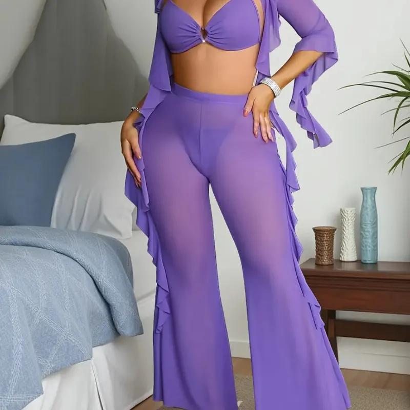 Conjunto de cuatro piezas con pantalones de malla transparente con volantes en un color liso, perfecto para el verano en estilos europeos y americanos 90% Poliéster, 10% Elastano
