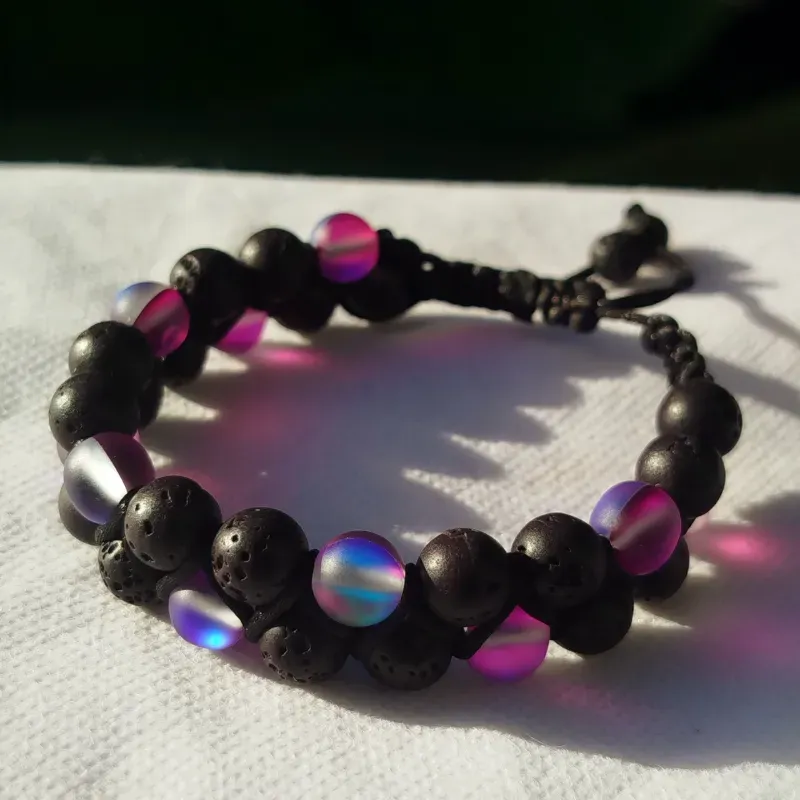 Pulsera artesanal de piedra volcánica natural combinada con cuarzo electrificado morado ✨