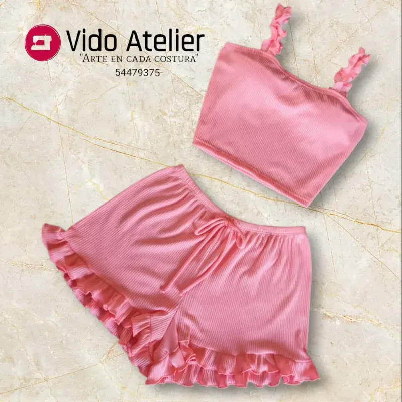 Pijama de 2 piezas corto fruncido Rosa chicle