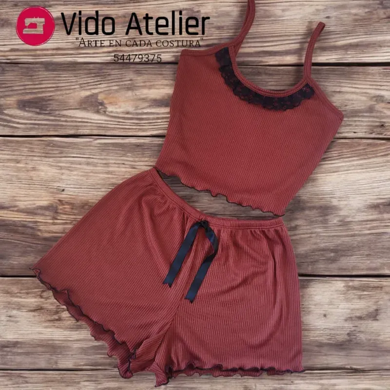 Pijama de 2 piezas corto Marrón con plisado