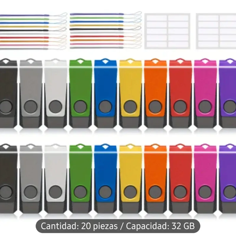 Unidades USB de 32GB memoria USB , pen drive, herramienta portátil para almacenamiento y transferencia de datos, incluye cordones de colores variados. Y pegatina para titular