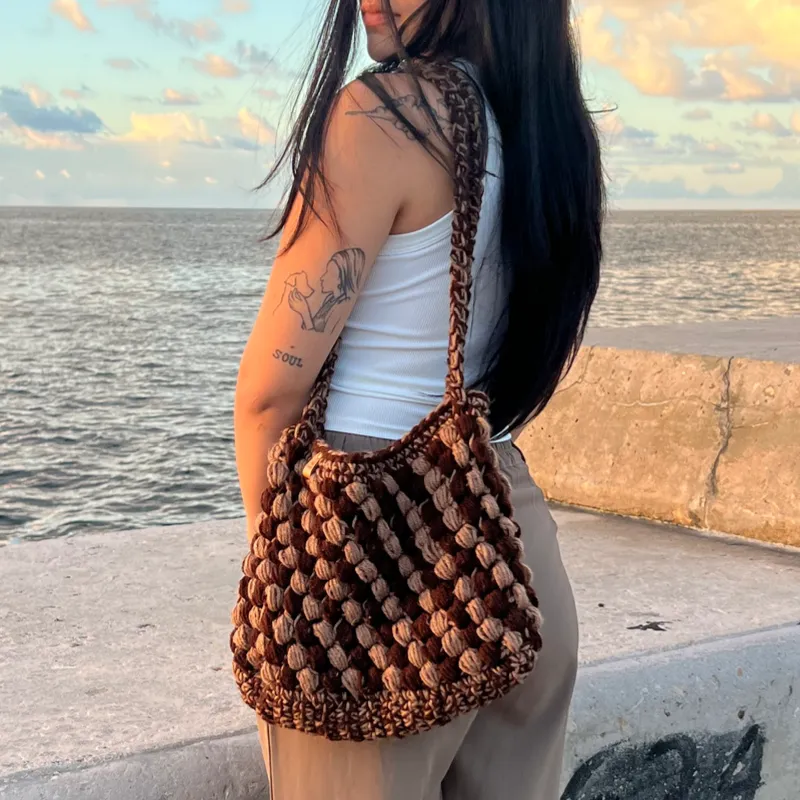 Creado con el punto puff, mezclando dos tonos de colores que puedes elegir a tu preferencia. Su asa es un cordón que te permite utilizarlo de distintas formas, un bolso que mezcla lo estética con lo práctico.