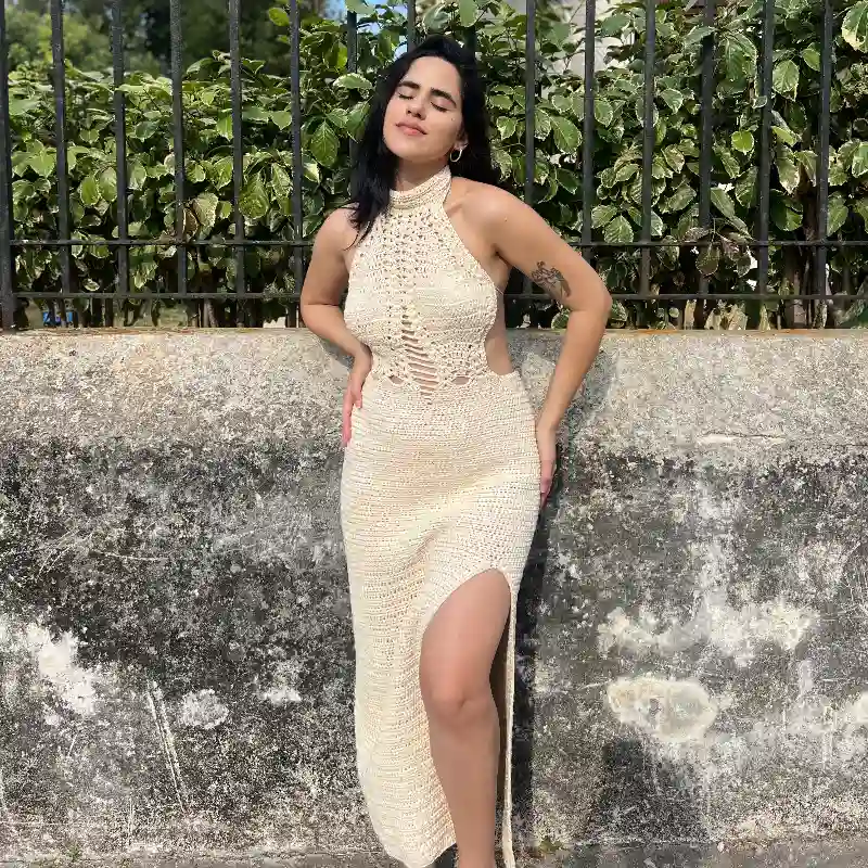 Elástico a la cintura para que ajuste con facilidad, cuello alto abrochado con botones que son perlas