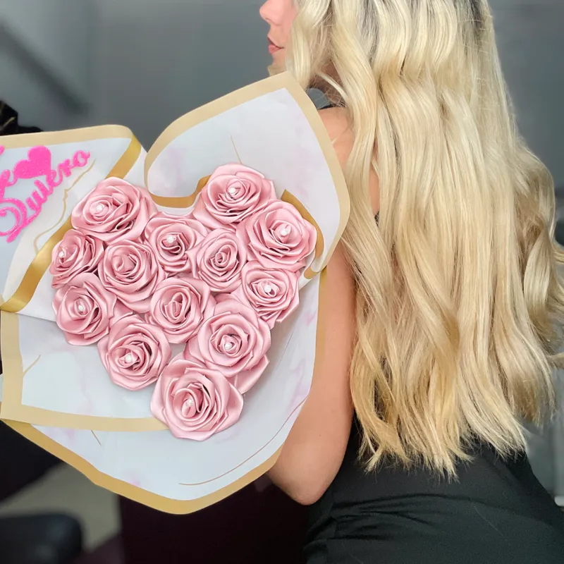 Ramo en forma de coraz贸n tono rosa p谩lido de 13 rosas eternas con detalle en perla -30 cm de alto