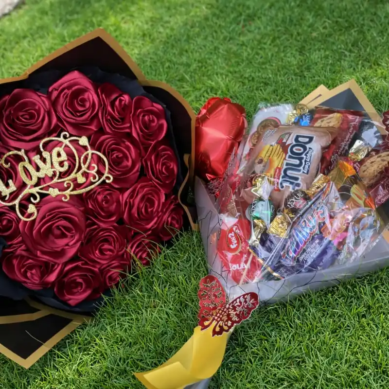 Ramo de 18 rosas + ramo de dulces variados