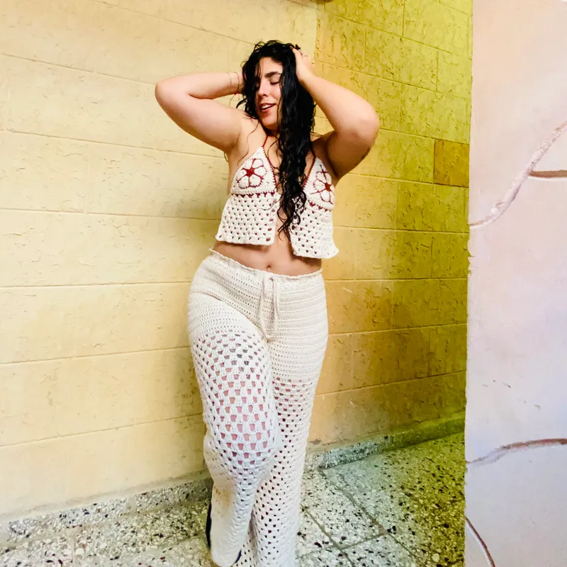 Conjunto completo de crop top y pantalón ancho elaborado totalmente en técnica de crochet. El top de estilo halter presenta flores decorativas en color marrón . Pantalones calados de pierna ancha con cordón ajustable en la cintura. Confeccionado en hilo de algodón suave y transpirable, ofreciendo comodidad y un ajuste adaptable.
