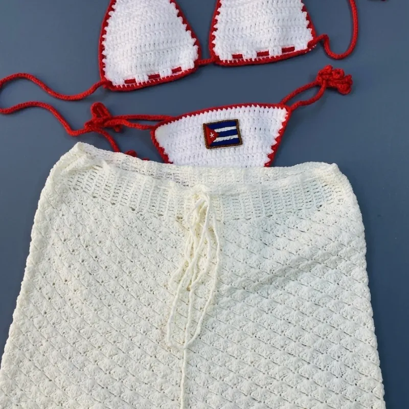 Exclusivo conjunto de salida de playa que incluye bikini blanco con bordes rojos y una falda midi de patrón "abanico" o "concha". La falda presenta una textura rica y calada que permite ver sutilmente el traje de baño, con un cordón ajustable para un talle perfecto.