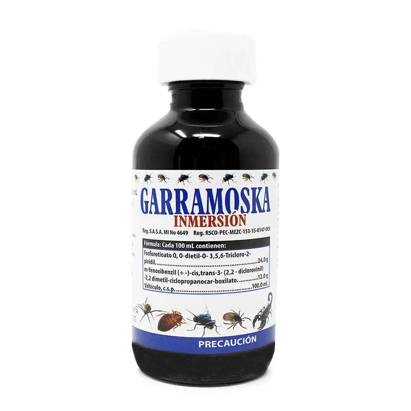 Cuando el volumen del baño disminuye 1,000 litros, reponga el agua y agregue 2 litros de Garramoska Inmersión. Aspersión Instalaciones: 2 ml por litro de agua.