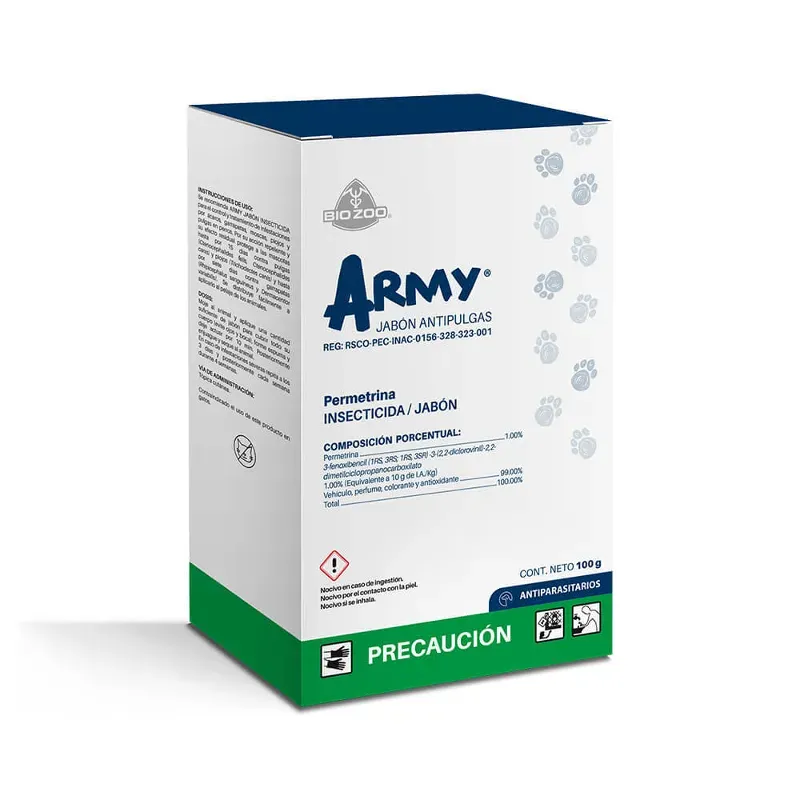 Se recomienda ARMY JABÓN INSECTICIDA para el control y tratamiento de infestaciones por ácaros, garrapatas, moscas, piojos y pulgas en perros. Por su acción repelente y su efecto residual protege a las mascotas hasta por 15 días contra pulgas (Ctenocephalides felis, Ctenocephalides canis) y piojos (Trichodectes canis) y hasta por siete días contra garrapatas (Rhipicephalus sanguineus y Dermacentor variabilis). Se distribuye fácilmente a aplicarlo al pelaje de los animales.