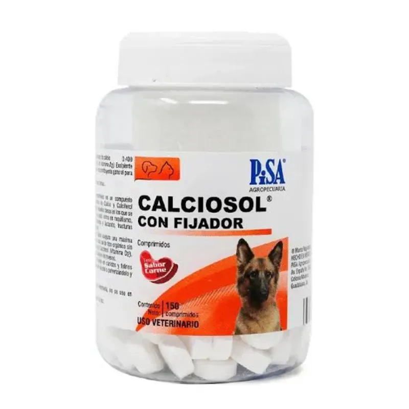 Calcio + Vitamina D2 FÓRMULA Cada comprimido contiene: Gluconato de calcio: 0.400 9 Calciferol: 0.0125 mg (equivalente a 500 U.I. de vitamina D2) Excipiente c.b.p 0.460 g. INDICACIONĖS Recalcificante y reconstituyente general para perros y gatos. Calciosol con fijador comprimidos es un compuesto calcico-vitamínico, formulado con Gluconato de Calcio y Calciferol (vitamina D2) como fijador; indicado en todos aquellos casos en los que se requiera suplir o complementar al aporte de calcio como en raquitismo, osteomalacia, osteoporosis, hembras gestantes y lactando, fracturas óseas convalecientes y animales en desarrollo. La formulación a base de Gluconato de Calcio asegura una máxima absorción y asimilación del Calcio va que es una sal de tipo orgánico sin problemas de tolerancia. Se adiciona además Calciferol (vitamina D2).