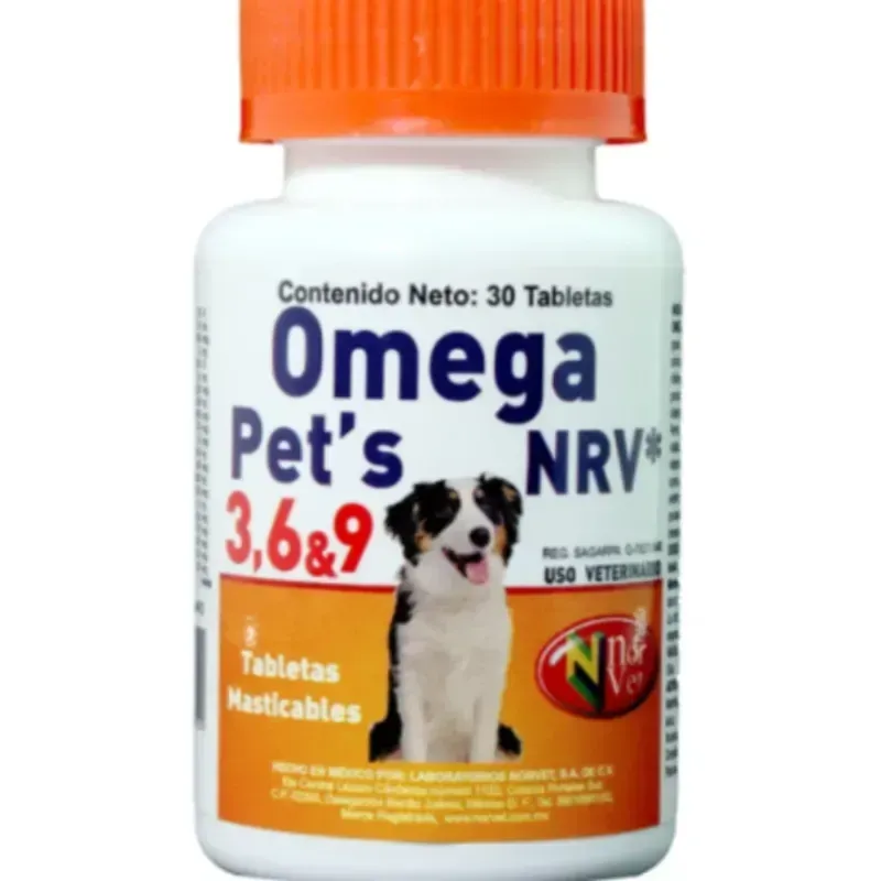 OMEGA PET´S NRV* 3,6 & 9 Contiene los principales ácidos grasos esenciales asociados con vitaminas, minerales y aminoácidos que ayudan en problemas de reacciones inflamatorias como alergias, eccemas y prurito, que pueden ser provocadas por desbalances en la cadena de ácidos grasos. Además, para mejorar y mantener sana la piel y el pelo de los perros, complementar la dieta de animales y aumentar la vitalidad de los perros, como preventivo en la deficiencias de vitaminas y minerales, preparación de perros para exposición, como auxiliar en el tratamiento de artritis, seborrea idiopática, enfermedades inflamatorias de la piel, coadyuvante en procesos inflamatorios crónicos. Contiene vitaminas y minerales necesarios para un adecuado metabolismo de la piel.