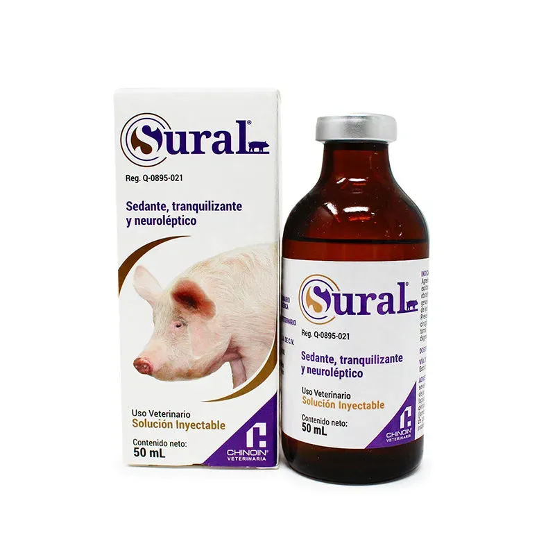 ADVERTENCIAS: Sural® es bien tolerado y tiene un muy amplio margen de seguridad, la salivación y el jadeo pueden presentarse cuando se administra a altas dosis, estos efectos desaperecen espontáneamente y no dejan daños. En cerdos sementales no se debe exceder la dosis de 1 ml/20 kg. Sural®, a dosis terapéuticas no presenta efectos adversos en: Partos, lactación, instinto maternal, consumo de alimento, circulación, temperatura corporal y frecuencia cardiaca. En caso de excitación severa no debe de sobredosificarse, sino dejar tranquilo al animal durante un lapso de 15-20 minutos. Aplíquese detrás de la oreja o en el muslo (jamón). No debe aplicarse en la capa de grasa, pues los resultados serán insatisfactorios.