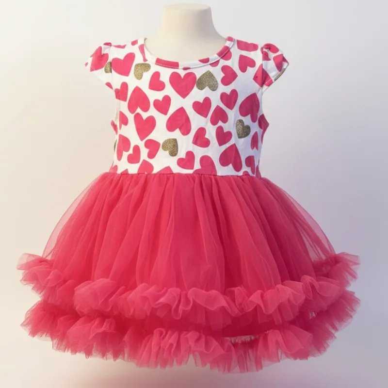 ¡Pura ternura en una sola prenda! Vestido de dos texturas con falda de tul ultra pomposa y estampado de corazones. Cómodo, ligero y listo para brillar.