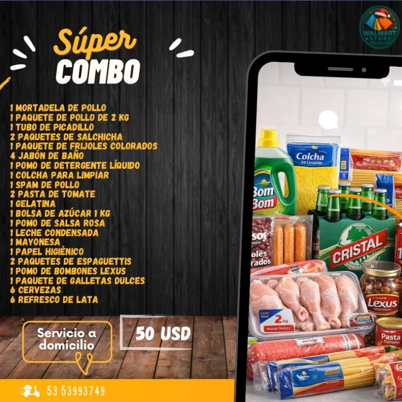 1 mortadela de pollo 1 paquete de pollo de 2 kg 1 tubo de picadillo 2 paquetes de Salchicha 1 Paquete de Frijoles Colorados 4 jabón de baño 1 pomo de detergente líquido 1 Colcha para limpiar 1 Spam de Pollo 2 Pasta de tomate 1 Gelatina 1 Bolsa de azúcar 1 kg 1 Pomo de Salsa Rosa 1 leche condensada 1 Mayonesa 1 Papel Higiénico 2 Paquetes de Espaguettis 1 Pomo de bombones Lexus 1 Paquete de galletas Dulces 6 cervezas 6 Refresco de Lata