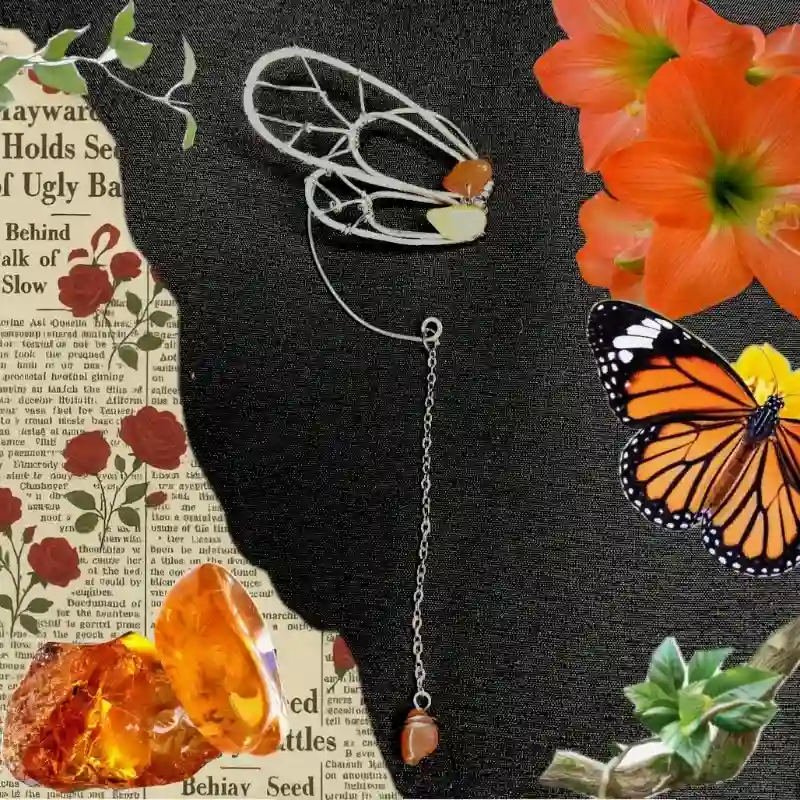 Esta es la reina de la colmena, con cuarzos color ámbar y miel. Así, emitiendo un aura dulce, de cuento, de fantasía conectando con la naturaleza, estiliza tu oreja derecha con esta preciosa pieza con alitas de abeja.