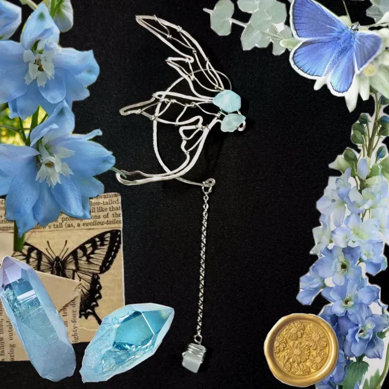 Alas de cielo en tu oreja derecha, sólo pueden significar que eres tan sabia como soñadora, vives en tu propio mundo. Con cuarzos azules y un diseño de alas especial, demuestra la persona única e importante que eres.