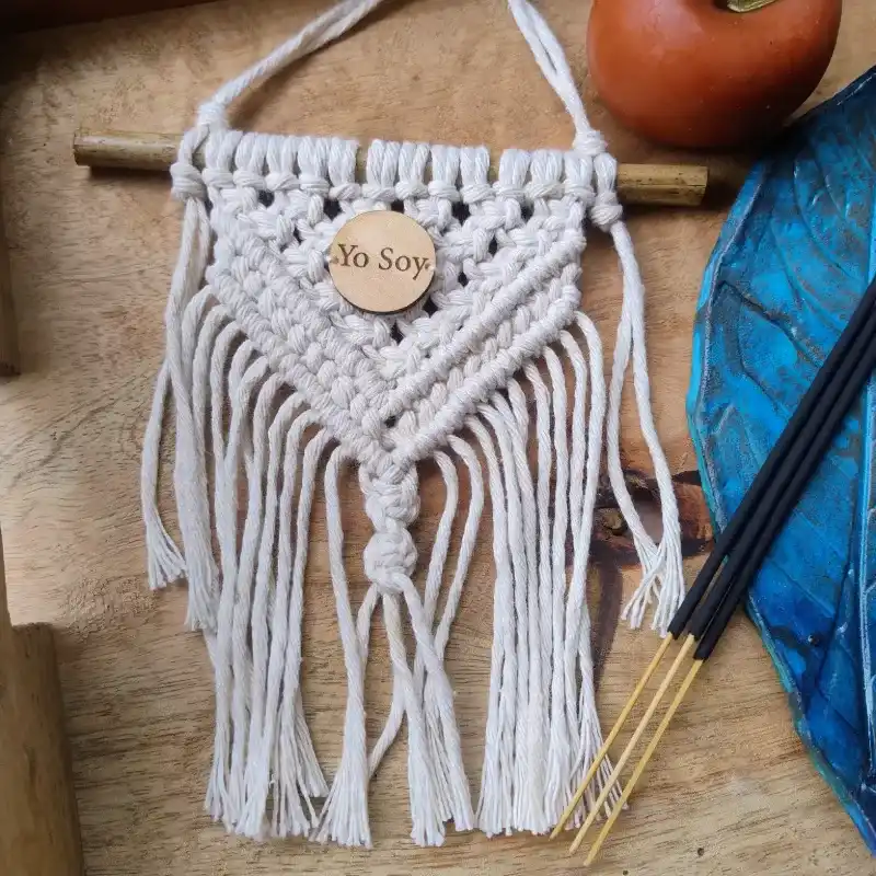 Minitapiz de macramé, complementado con una pieza redonda de madera grabada a láser.
