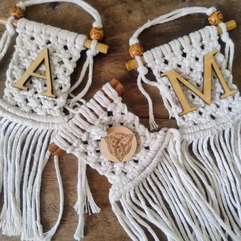 Mini tapiz macramé, con pieza grabada y cortada a láser .