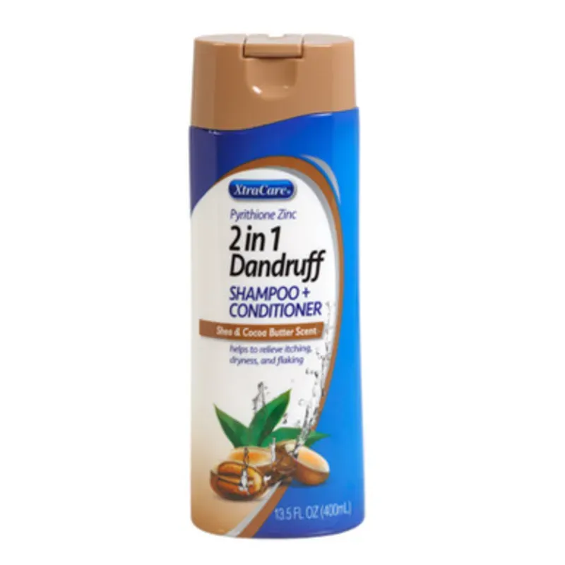 Champú y acondicionador anticaspa 2 en 1 de la marca XtraCare con aroma a manteca de cacao y karité.