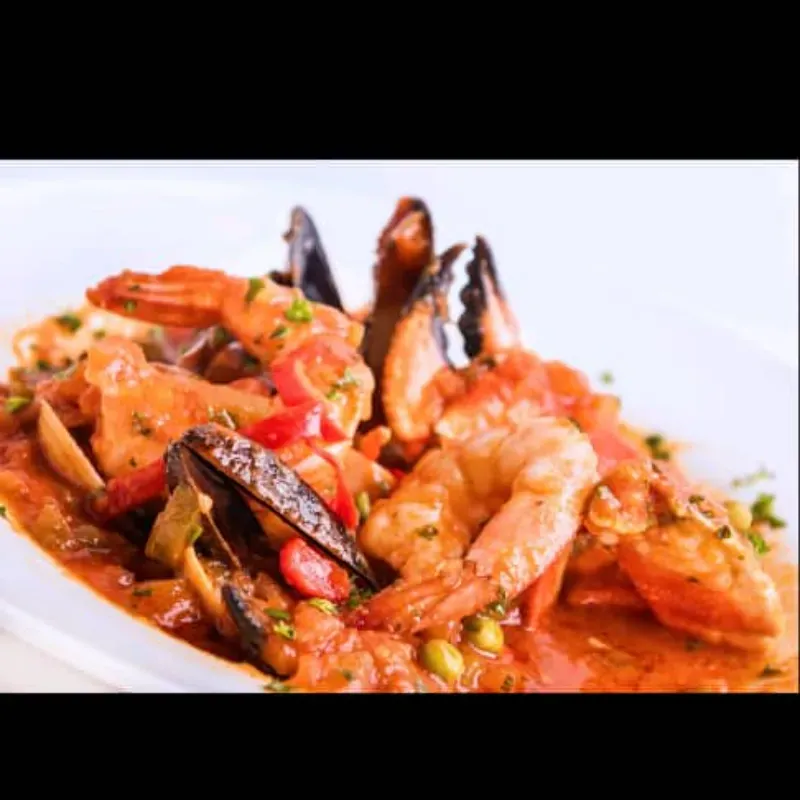 Exquisita combinación de mariscos cocidos en salsa de tomate