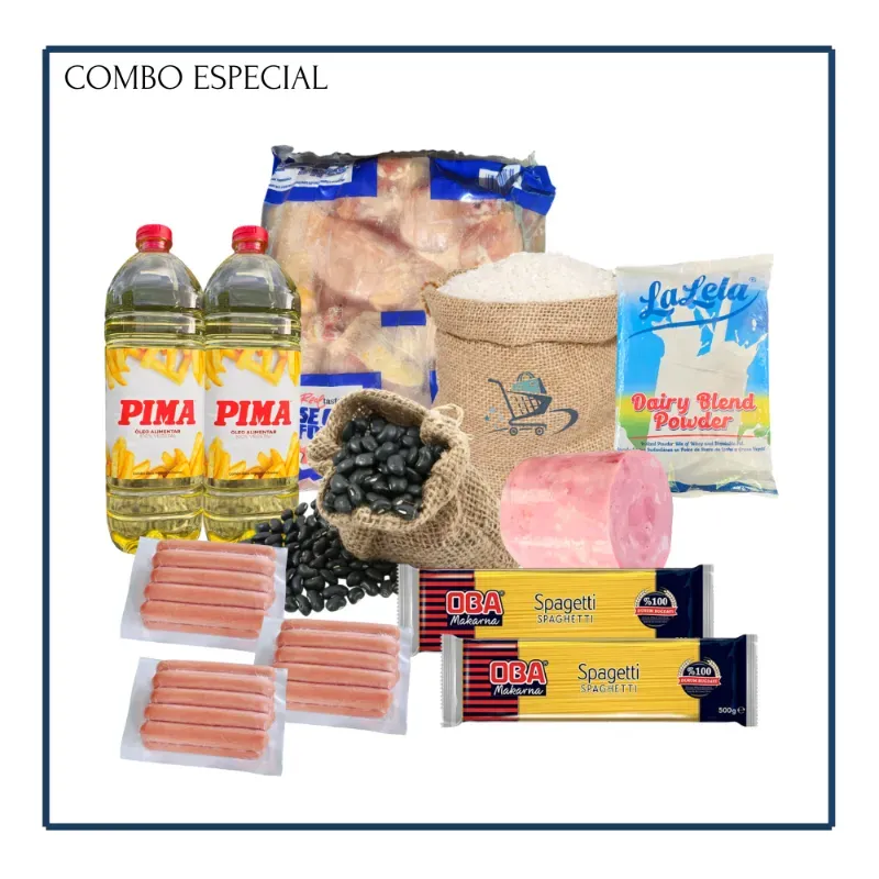 🌻 2 Pomo de Aceite 🐔 10Lb de Pollo 🍚 10Lb de Arroz 🫘 5Lb de Frijoles 🐮 1 Bolsa de Leche en Polvo de 900g a 1kg 🌭 3 Paquete de salchicha de 10u 🐖 2Lb Jamón criollo de cerdo 🍜 2 Espaguetis (500g)