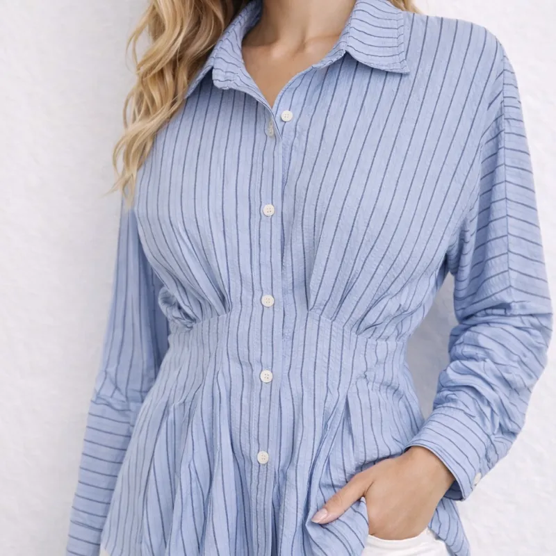 Blusa de mangas largas con diseño de rayas y ajuste en la cintura que estiliza la figura. Ideal para looks casuales con un toque sofisticado.