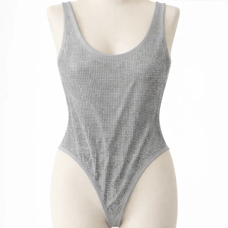 Body gris con acabado de brillos en toda la parte frontal que aporta un efecto llamativo y moderno. Diseño de tirantes anchos y escote redondo con corte alto en caderas que estiliza la figura y alarga visualmente las piernas.