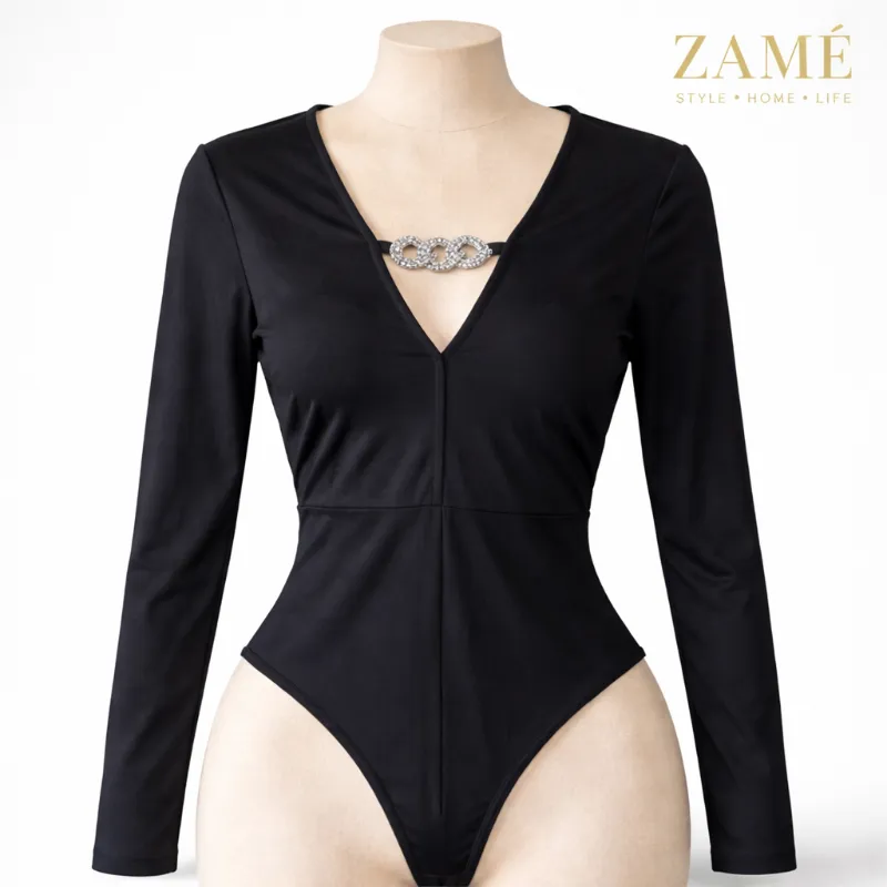 Body negro de manga larga con escote en V que estiliza la figura y aporta un toque sofisticado. Destaca por su detalle brillante en el escote que eleva el diseño y lo hace ver más elegante. Tela suave, cómoda y ajustada al cuerpo. Ideal para looks de noche, salidas o combinar con jeans y faldas.