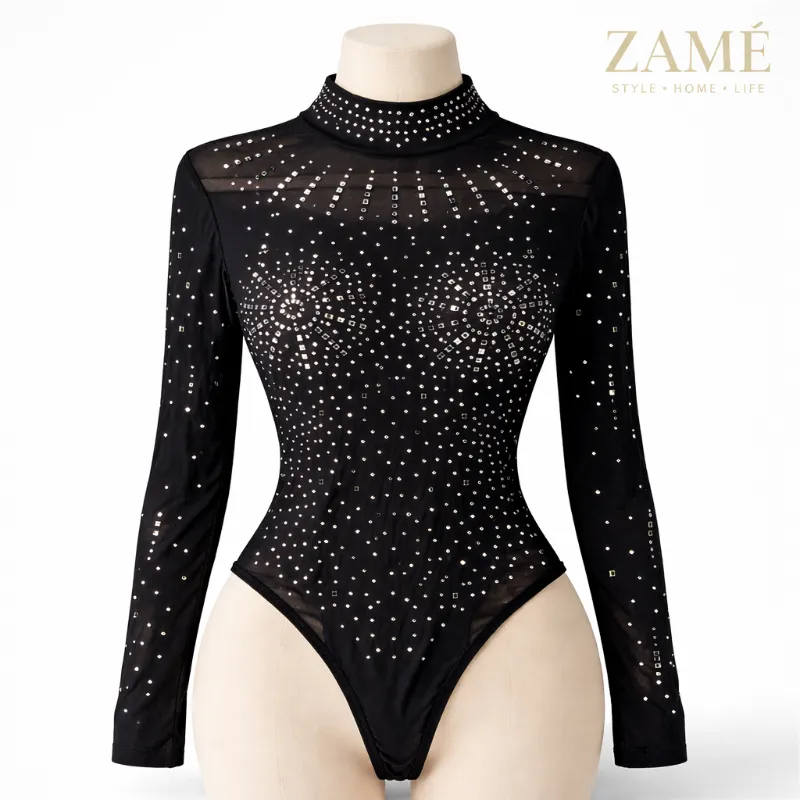 Body negro de manga larga con aplicación de brillos en diseño frontal que aporta un efecto elegante y llamativo. Tela ligera con transparencias sutiles y ajuste al cuerpo que estiliza la silueta. Cuello alto y acabado moderno, ideal para looks de noche, fiestas o salidas donde quieras destacar con estilo.