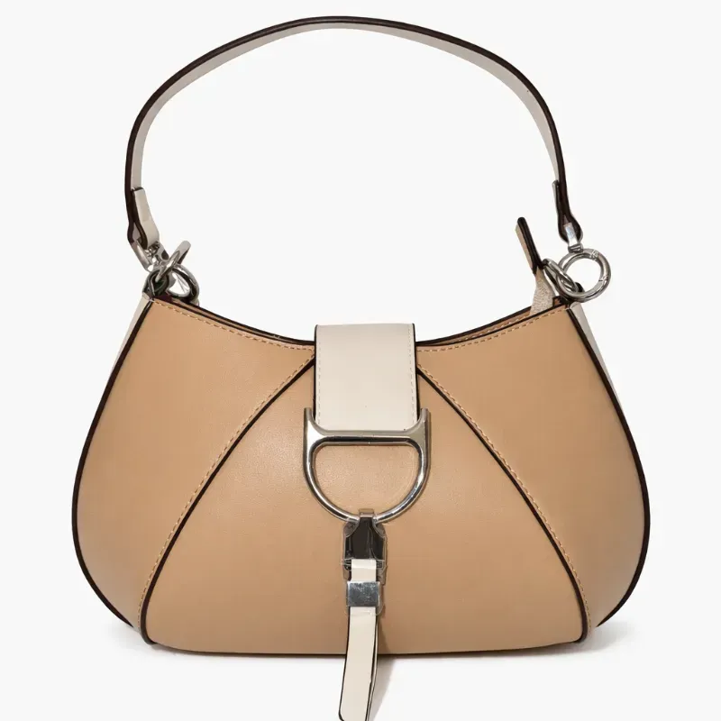 Bolso compacto y sofisticado en tonos beige con herrajes plateados. Perfecto para elevar cualquier look con un toque moderno y chic. Ideal para uso diario o salidas especiales.