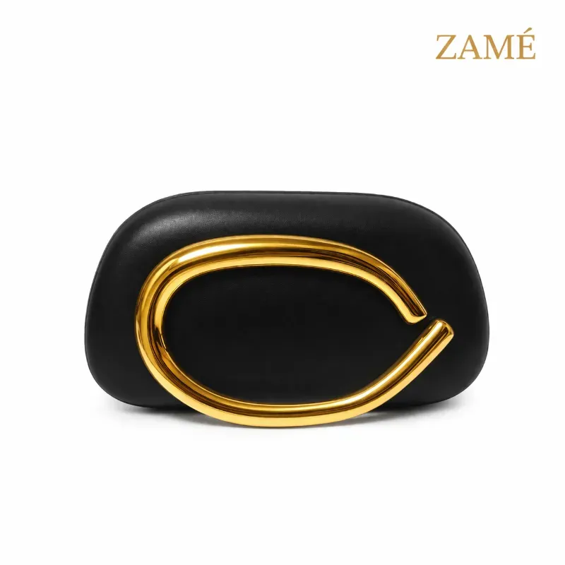 Cartera de diseño moderno en color negro con asa dorada tipo escultura que la convierte en una pieza única ✨