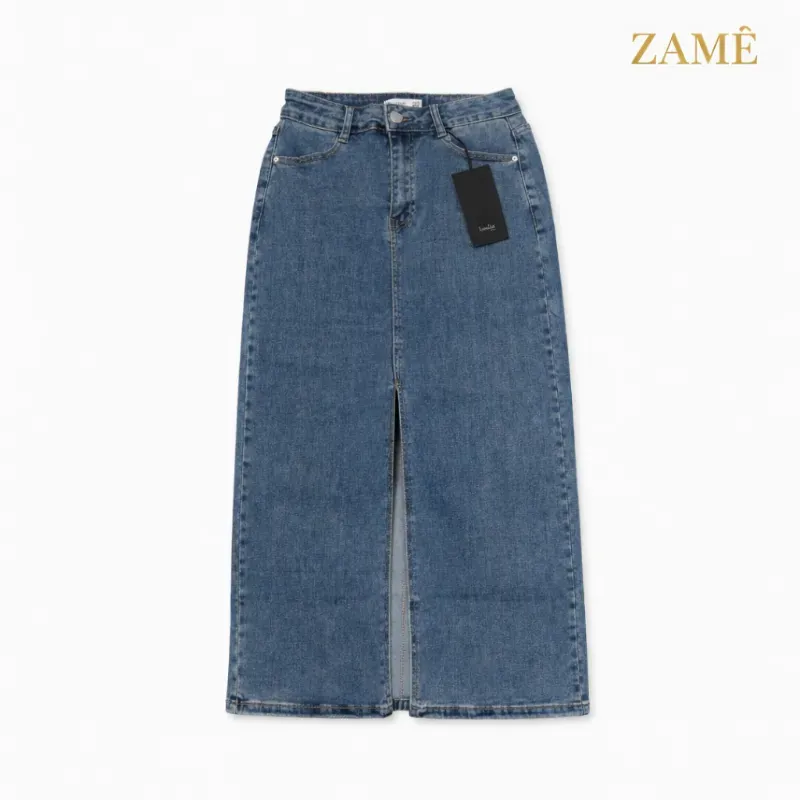 Falda de mezclilla de tiro alto con diseño recto y abertura frontal que estiliza la figura ✨