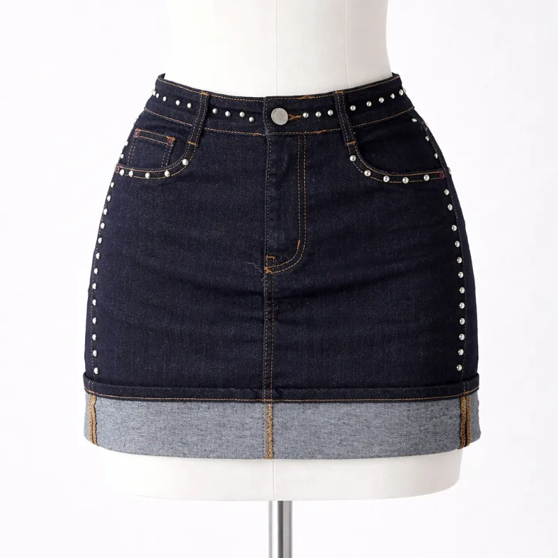 Falda mini en denim con detalles de tachas que aportan un toque moderno y diferente. Ideal para looks casuales con estilo.