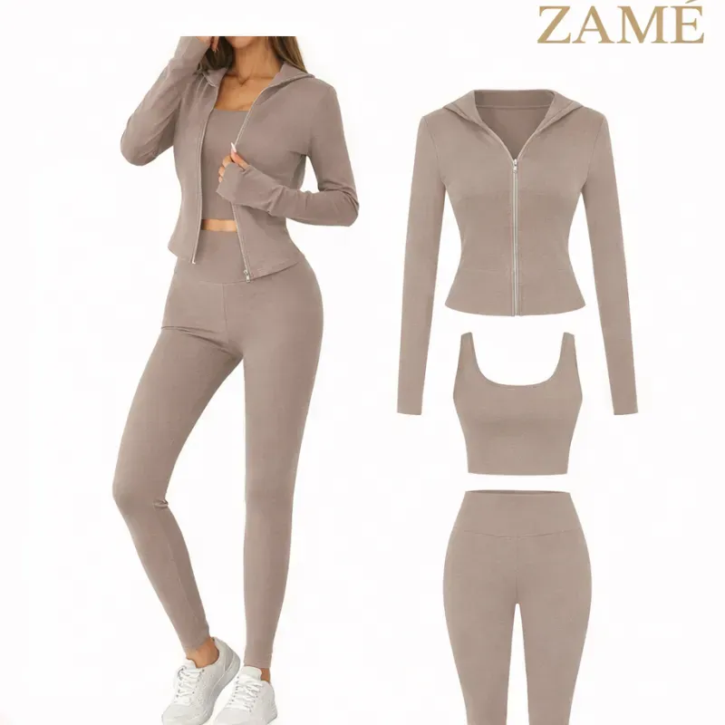 Conjunto completo con chaqueta, top y leggings de cintura alta que moldean y estilizan tu figura. Tela suave, elástica y cómoda para usar todo el día. Perfecto para entrenar o un look casual moderno. Disponible en tono neutro fácil de combinar.