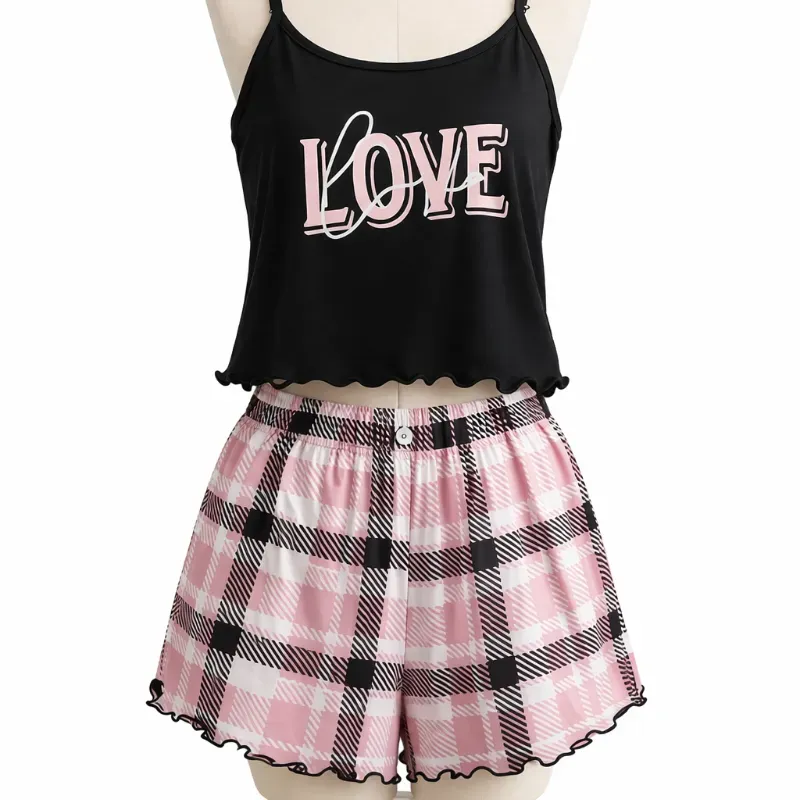 Conjunto de pijama cómodo y ligero con top negro de tirantes y short a cuadros rosados. Ideal para dormir fresca y con estilo.
